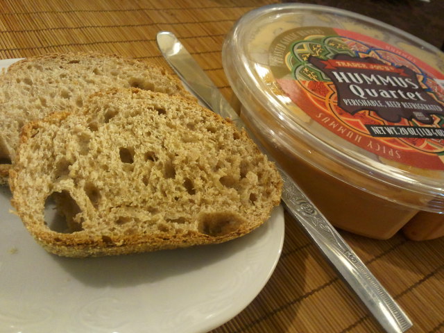 Lately I've been looking for different breakfast options that are quick and simple in the mornings. With going to the gym, getting ready for work, and squeezing in school I don't have time to actually cook a full on breakfast. I hate to skip breakfast too because my hunger pang always hits me shortly after I leave the house and my stomach growls like an animal in a cage. (Imagine that in a quite classroom when doing exams........*embarrassing*) Trader Joe's hummus and artisan bread was a great discovery and got me through my morning hunger. :) I like how the hummus wheel had flavors that I actually liked. My favorite was the spicy flavor and devoured that in the first 2 days.