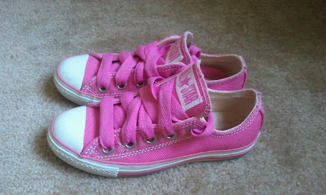 Converse Chuck Taylor- I couldn't believe my eyes when I saw these!! So bright and pink. Better yet was the enlarged canvas style and thick laces. I just couldn't pass them up.