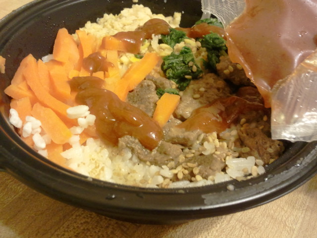 As far as taste goes it still doesn't compare to a nice homemade bibimbap. I found the beansprouts a little over powering and the sauce was more sweet than spicy. But for under $4 can't really complain. The rice is just the right amount and the meat is actually pretty good.