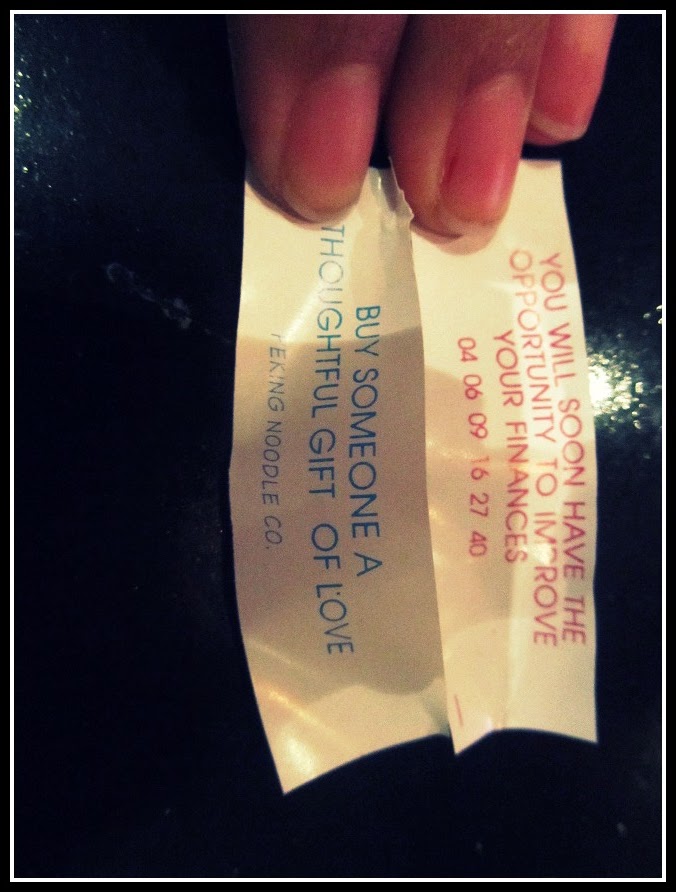 Our fortune cookie was surprisingly dead on for that month. Karina's couldn't be any more right with the gift she (and my coworkers) had gotten me recently. Mine was somewhat a standard fortune, but the timing was perfect in this situation. Good job, fortune cookie!