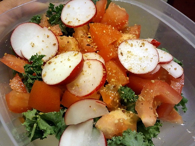 scrambled eggs with spinach, mushrooms, tomatoes, and guacamole.