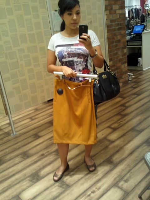 Oh, I came across this beautiful mustard colored skirt. (FYI- I have a weakness for mustard and olive colored clothes.) I was sad because this was the last one and it wasn't in my size. *sigh* Just one of the many "problems" we face as girls.